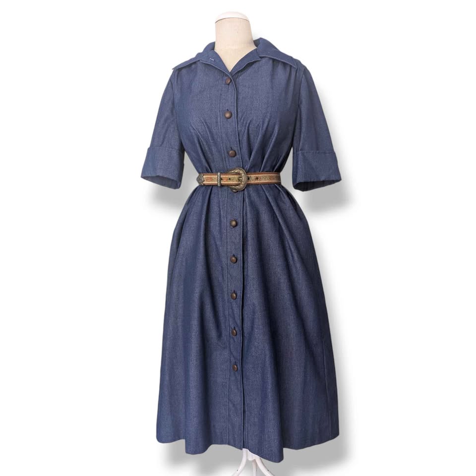 1970s Vintage Blue Denim Midi Day Dress
