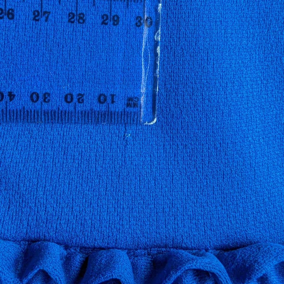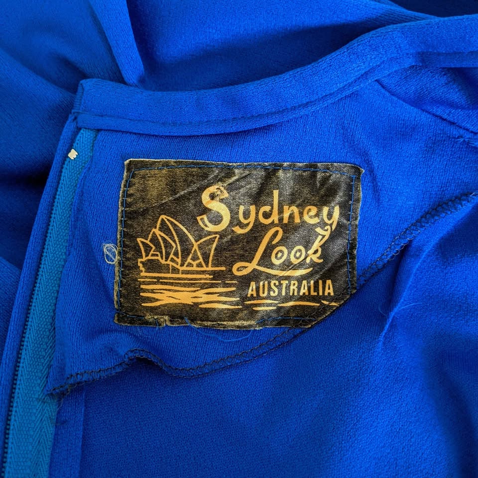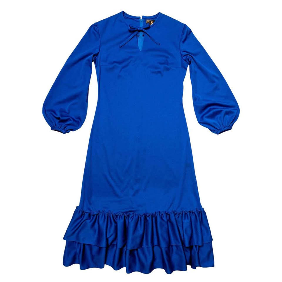 Beautiful 70's vintage bright blue, medium weight stretch polyester midi dress with balloon sleeves and ruffles on the hem! by 'Sydney Look'