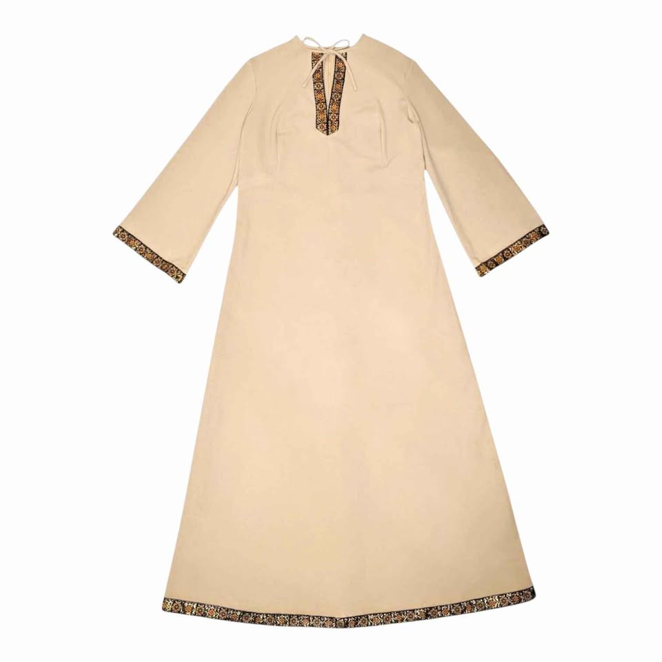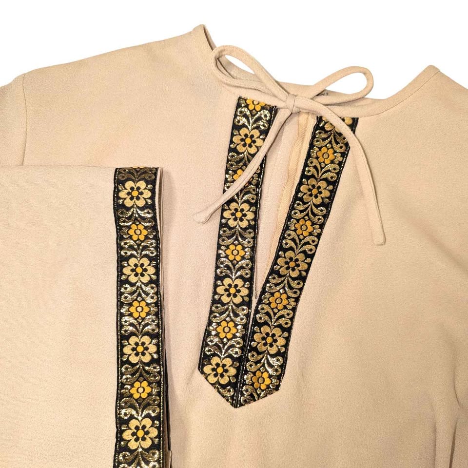 Groovy 70's kaftan style maxi dress with metallic gold flower power trim and flared sleeves!