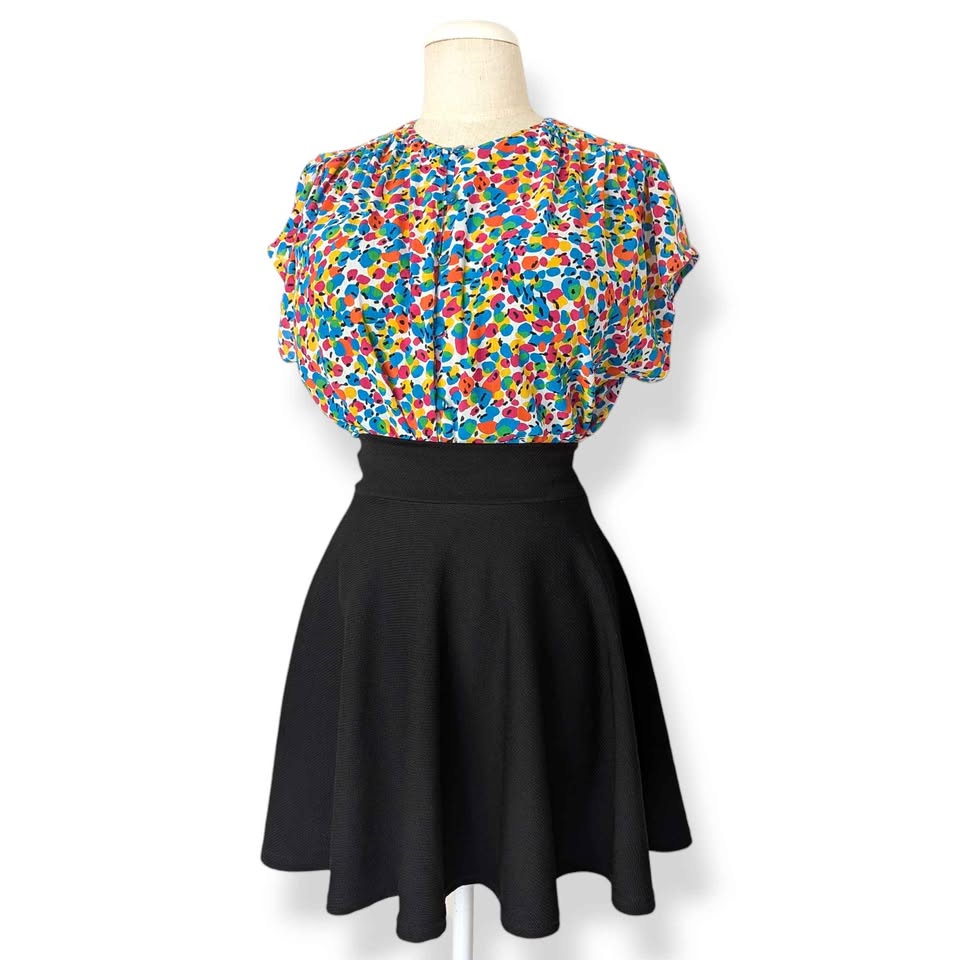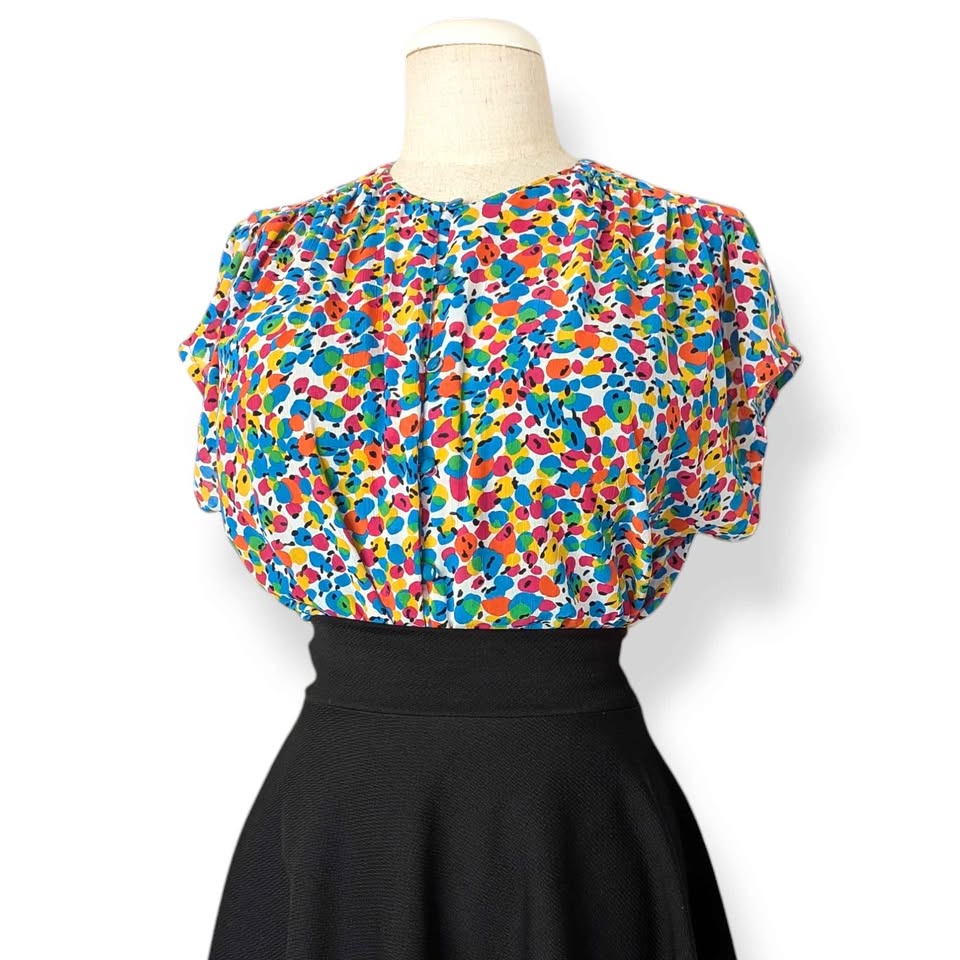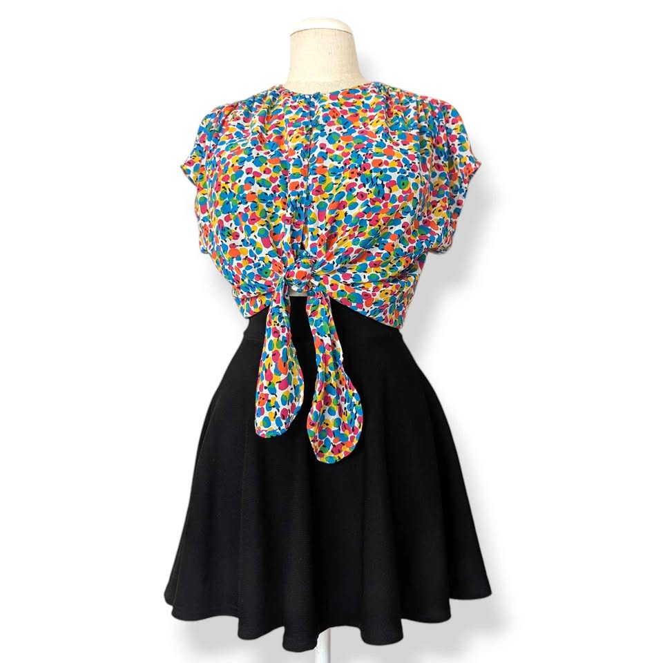 Super fun late 80's vintage crop top tie-front blouse with multicolour spotty print and gorgeous blue buttons. Lightweight polyester chiffon fabric with vibrant print!