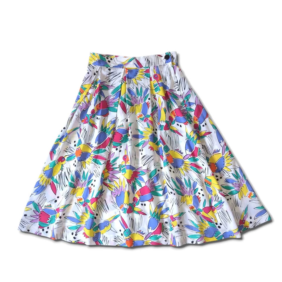 Such a fun piece!! Stunning late 1980s - early 1990s vintage colourful abstract bird print midi skirt. Beautiful 100% flowy lightweight rayon fabric.